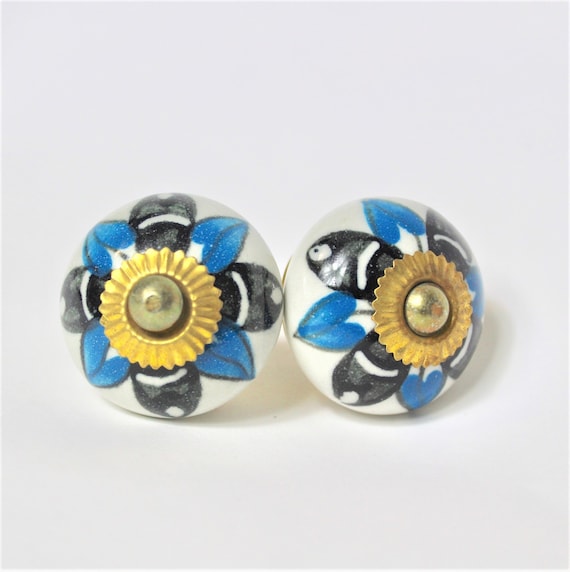 Set Of 2 Blue And Black Ceramic Knobs Cupboard Knobs Door Etsy