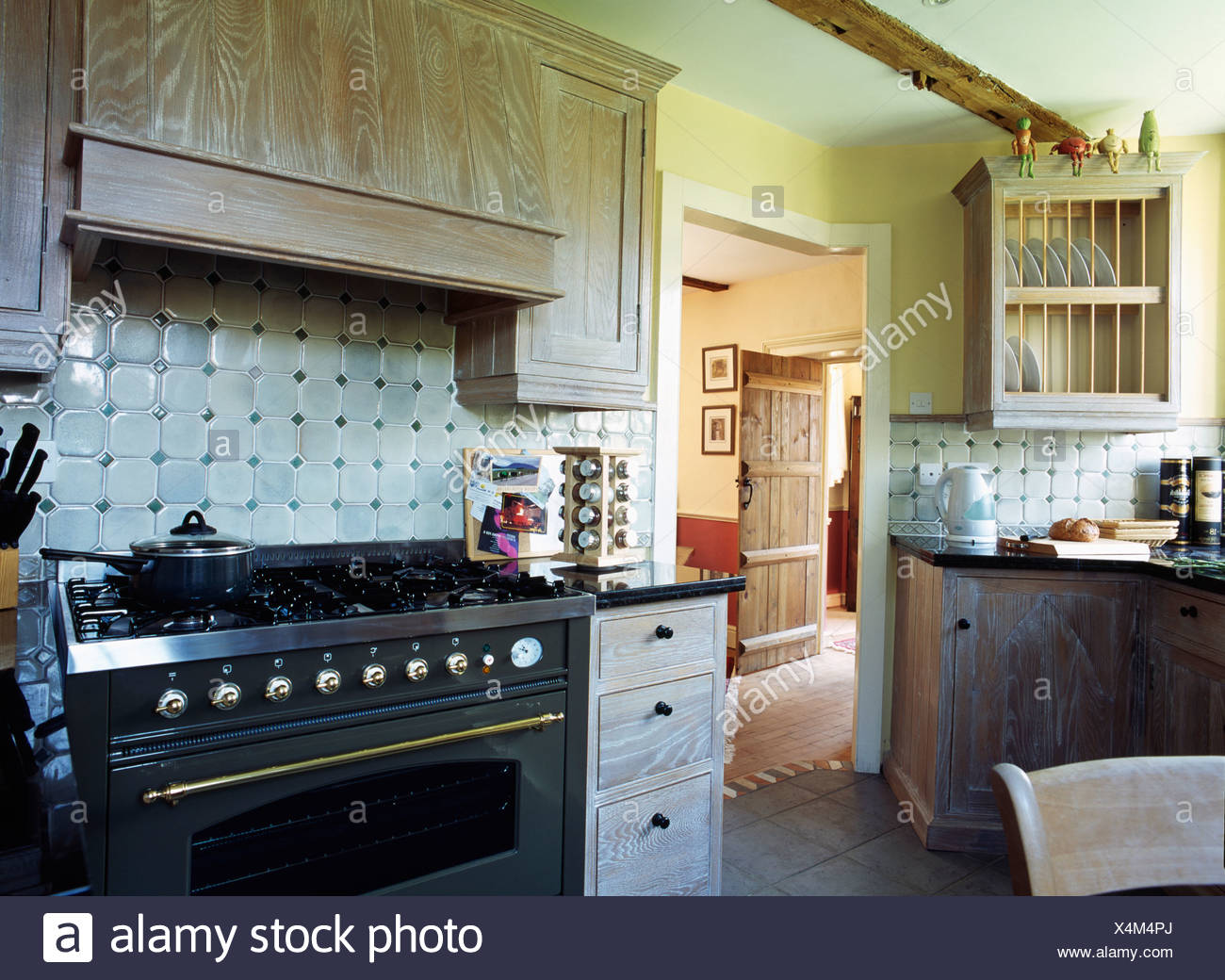 Large Black Oven In Country Kitchen With Wooden Cupboard Doors And